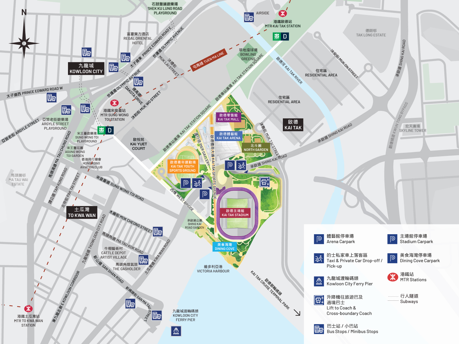 For those driving, three carparks are available: Stadium Carpark, Arena Carpark and Dining Cove Carpark, along with designated drop-off/pick-up areas for taxis and private cars. Please note that special arrangements for carparks and drop-off/pick-up areas will be implemented during events. Stay informed about traffic updates to ensure a smooth journey to Kai Tak Sports Park.
